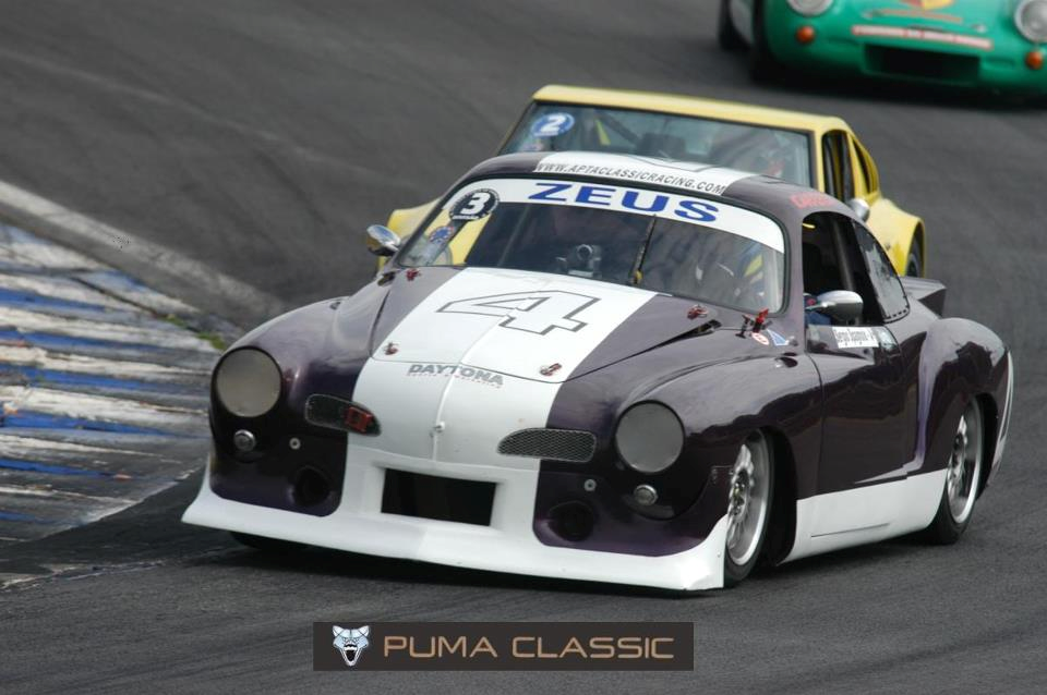The front bumper on the 'Ghia on the right is an aluminum one from a `74-`77 Vega (very strong, surprisingly light, and follows the lines of the 'Ghia nose quite well). The airdam is just a length of conveyor belt bolted up along the recessed bottom rail of the bumper; the "W" shape of the bumper stiffens the belt enough that it doesn't fold under at speed.