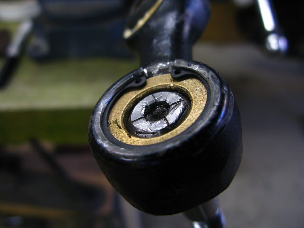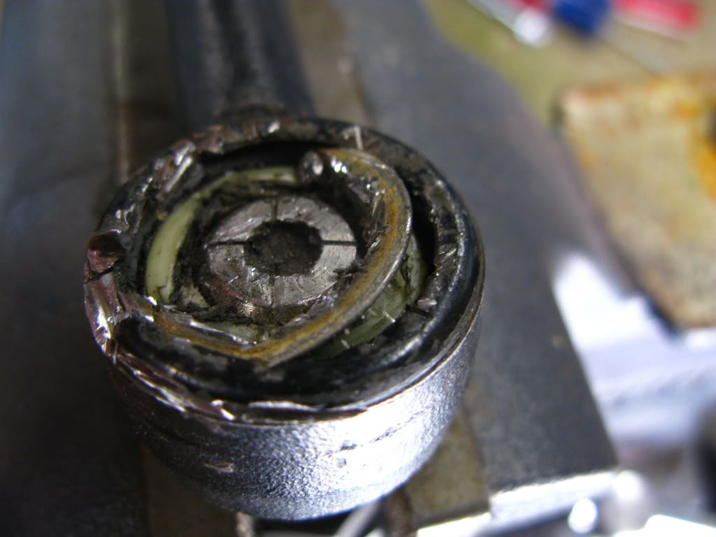 When i opened the first centerlink i didn't have any pics of how to do it as STF had just crashed and the great photos on the original centerlink rebuild thread were vanished. I didn't remember that the pictures Ray had taken showed that you can cut the grease cap by making slits that reach over the cavity wall (hope you'll understan what i mean). This way the cap would have already been in four pieces so it would have been easier to pul those last bits of the butchered grease cap out. So i just cut the grease cap as much as i could, with just about every Dremel tool i could find, until there was only a thin ring left. Then i strated to twist, push, pul and wiggle the ring out of its groove until it finally gave up and came out. I think it took something like two evening just to get both grease caps out...