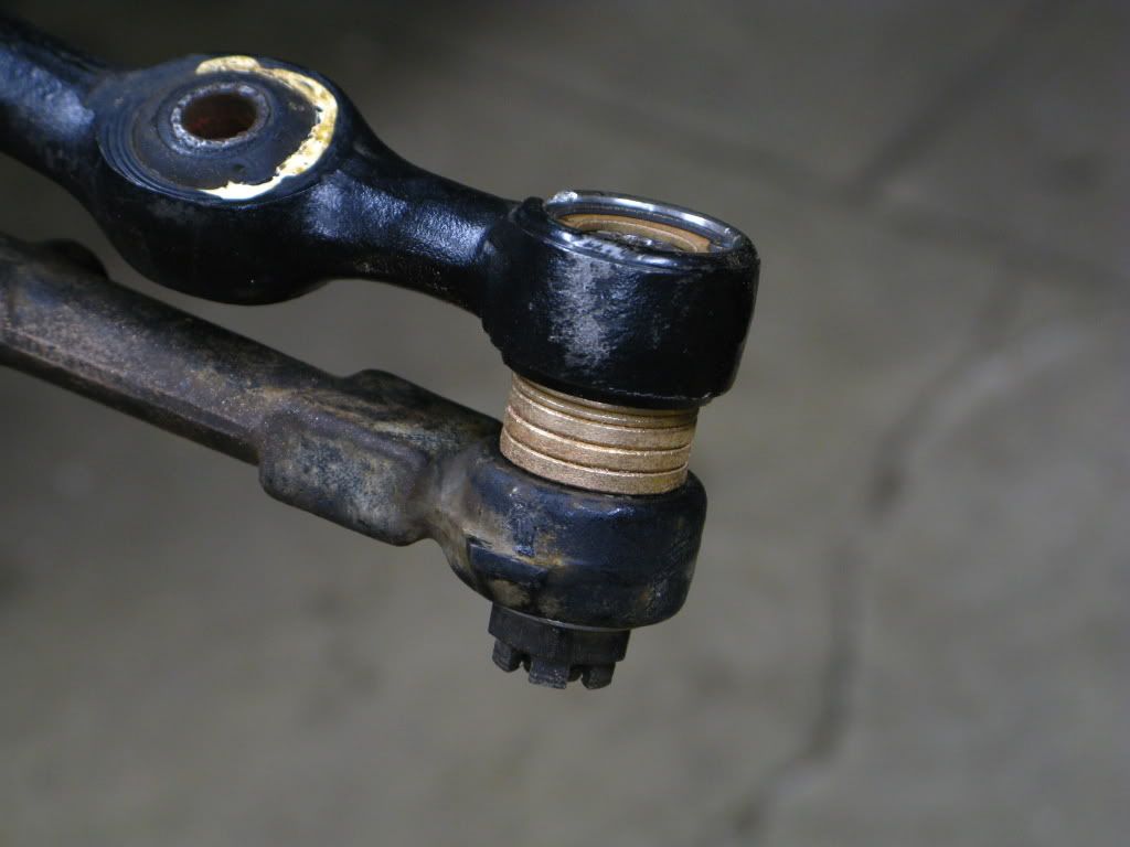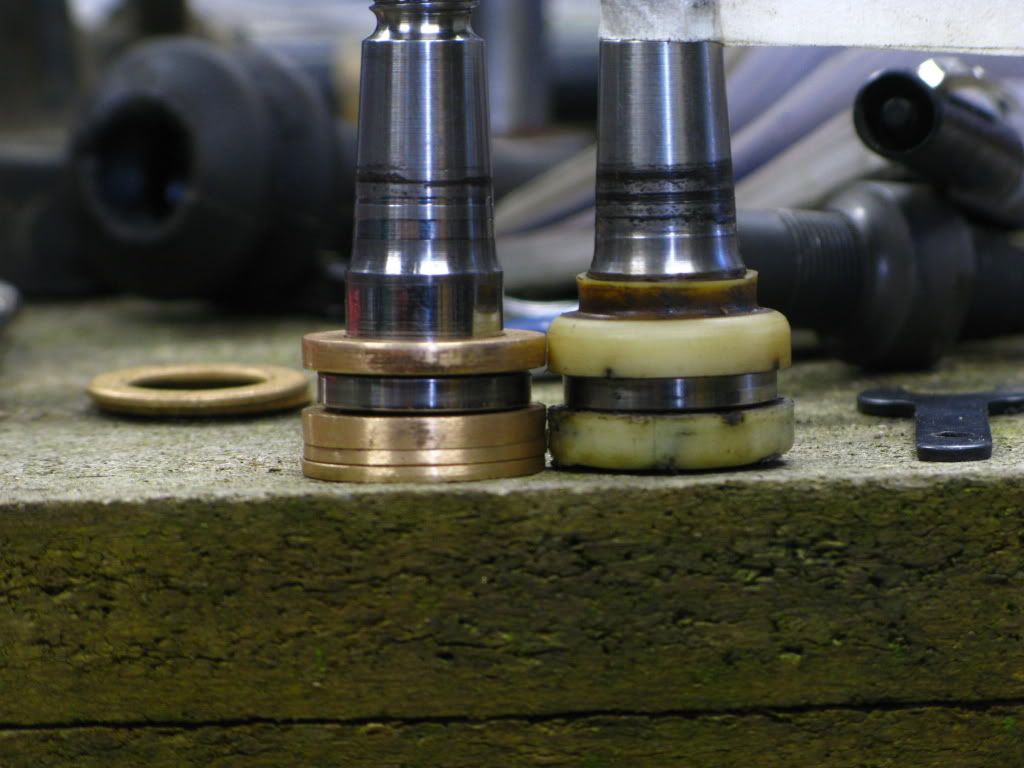 Also.....the plastic part whose collar went up through the cup and was the kind of spacer that wrapped around the pin and spaced the joint from the idler and pitman arms.....and the stack of bronze washers you have..can all be taken care of with one piece of bronze.....and is called a flanged bronze bearing. Looks like a peice of tube with a flange or ledge at one end.