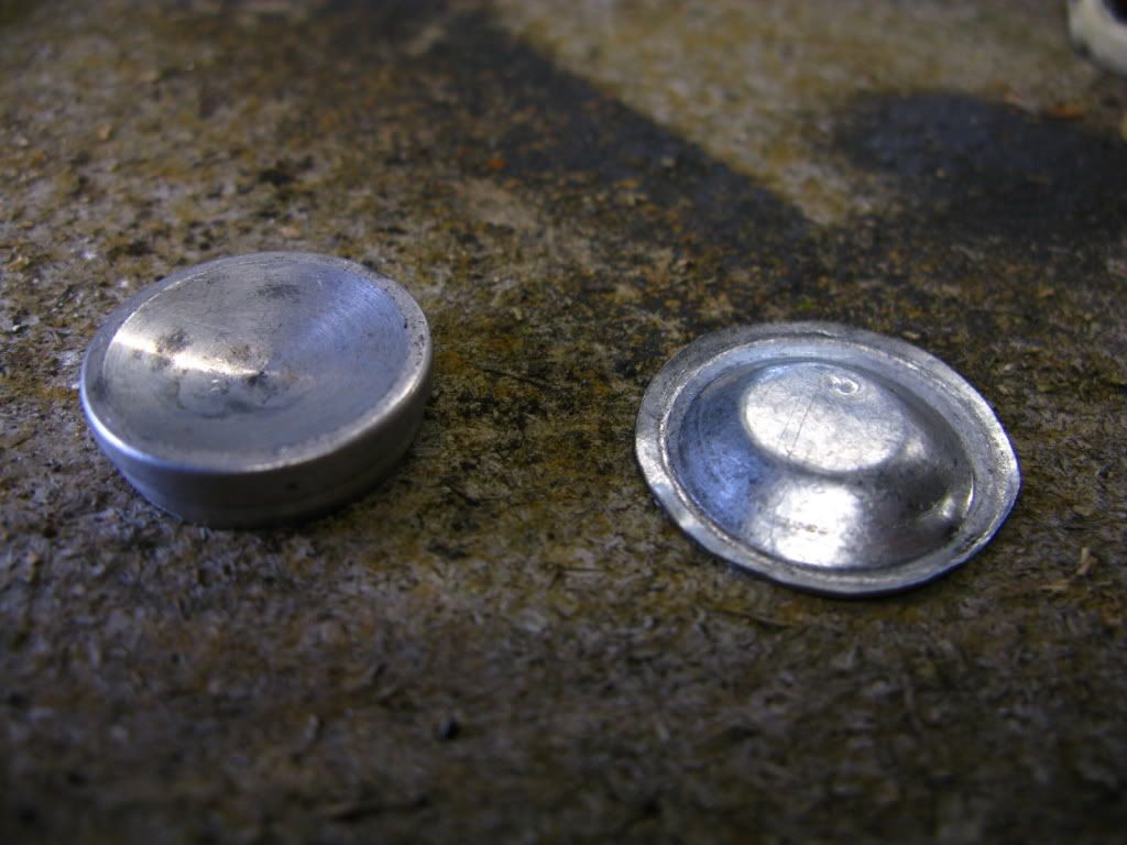 the material for the cap is made from a piece of tin flashing i found laying around (about 0.015"), and its so soft that all my attempts at using some kind of anvil/whatever just made it tear or pop right through. i cut out squares with tin snips and gradually trimmed it down to a rough circle. here you can see a couple early attempts in the background: